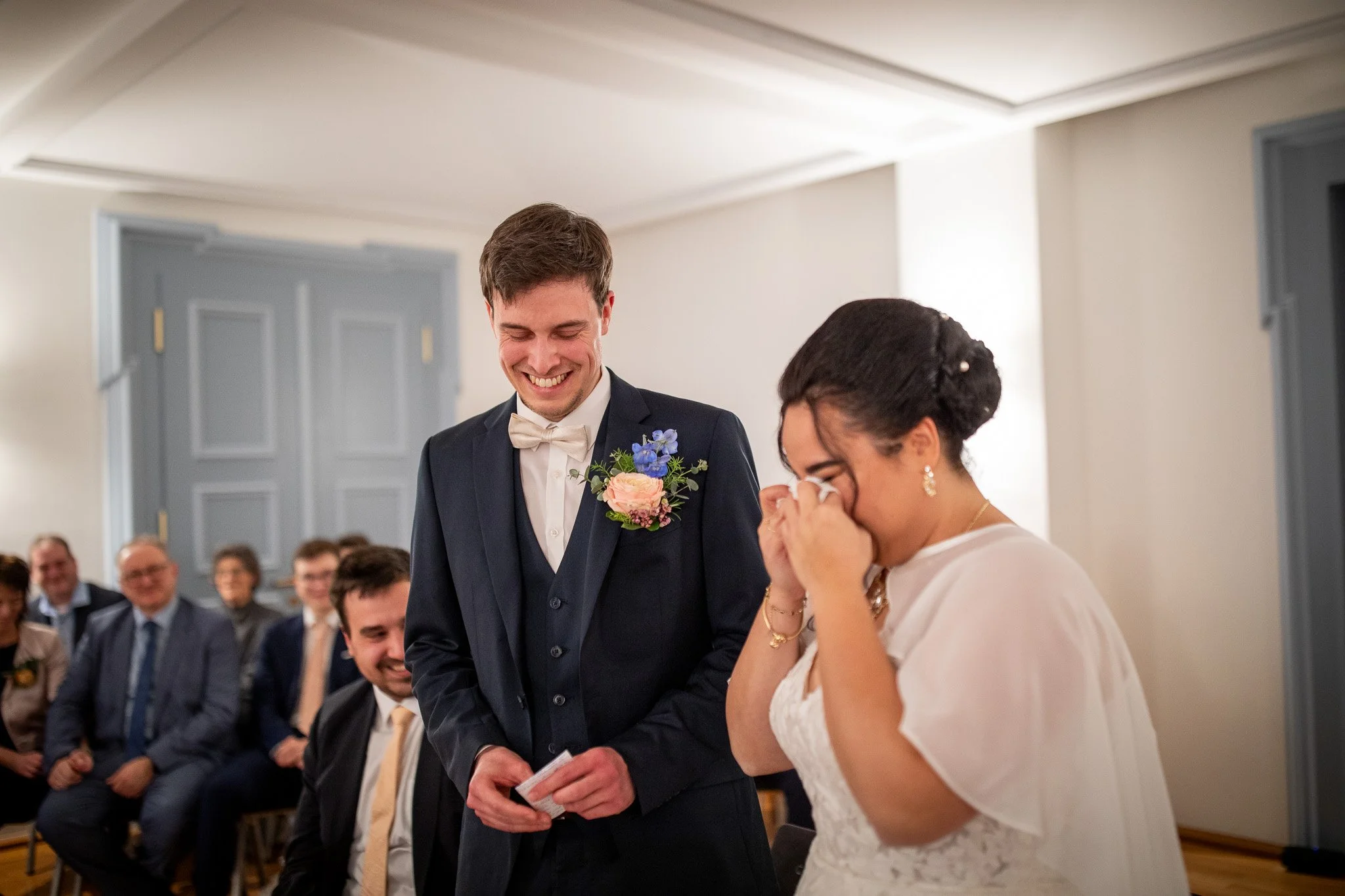 A couple dressed in wedding attire standing close together, with foreheads touching and eyes closed, outdoors surrounded by greenery and holding a colorful bouquet.